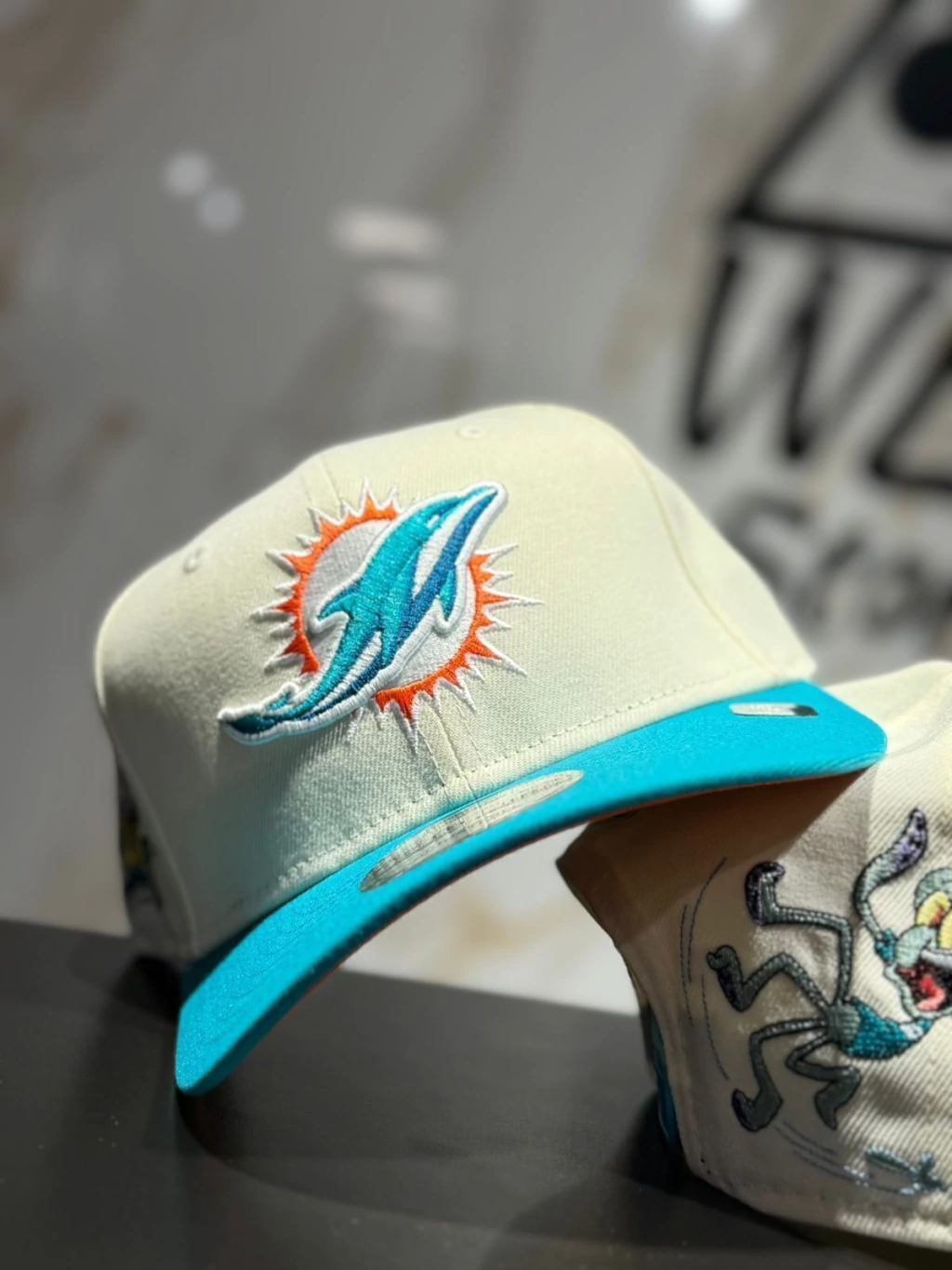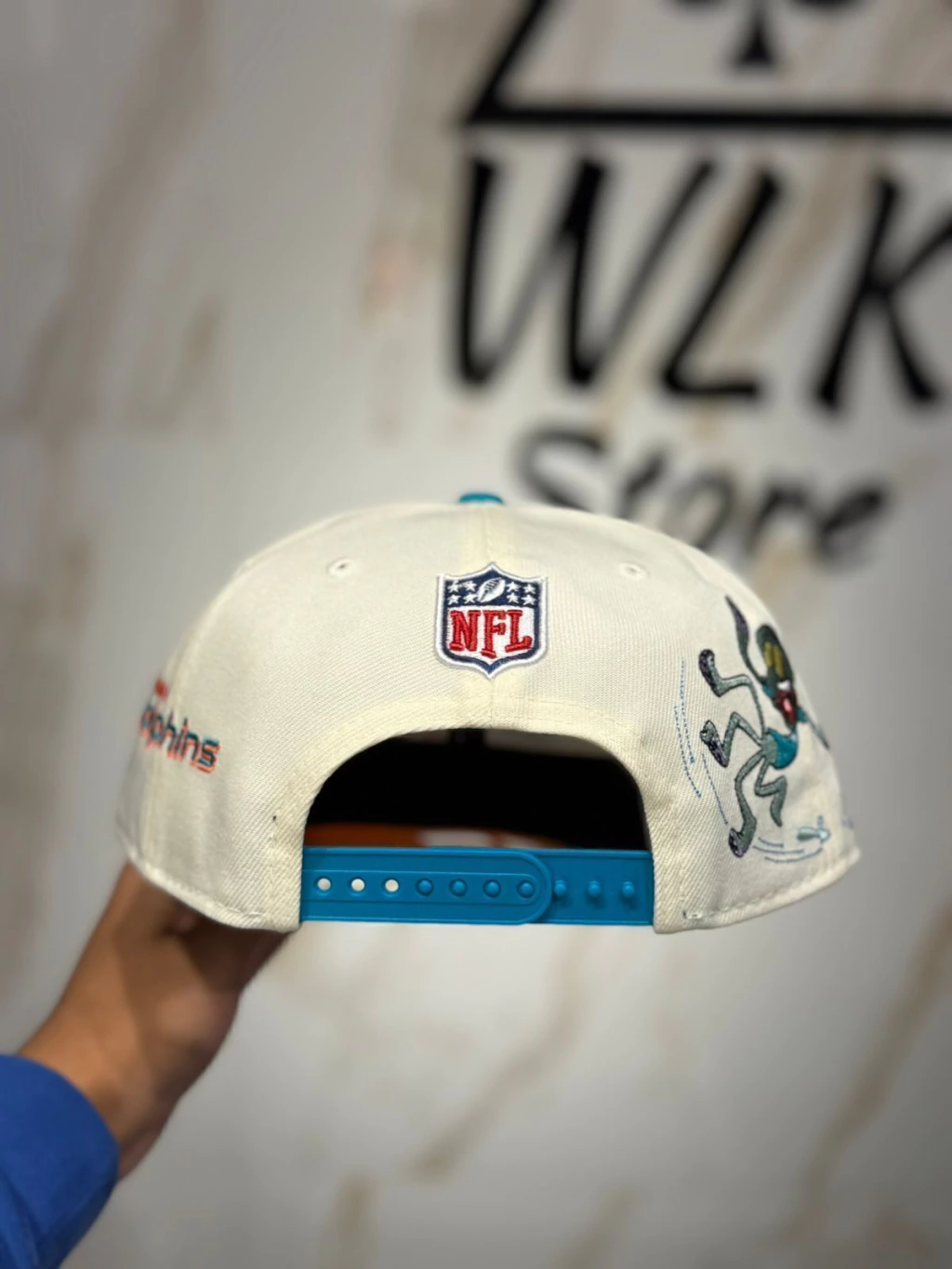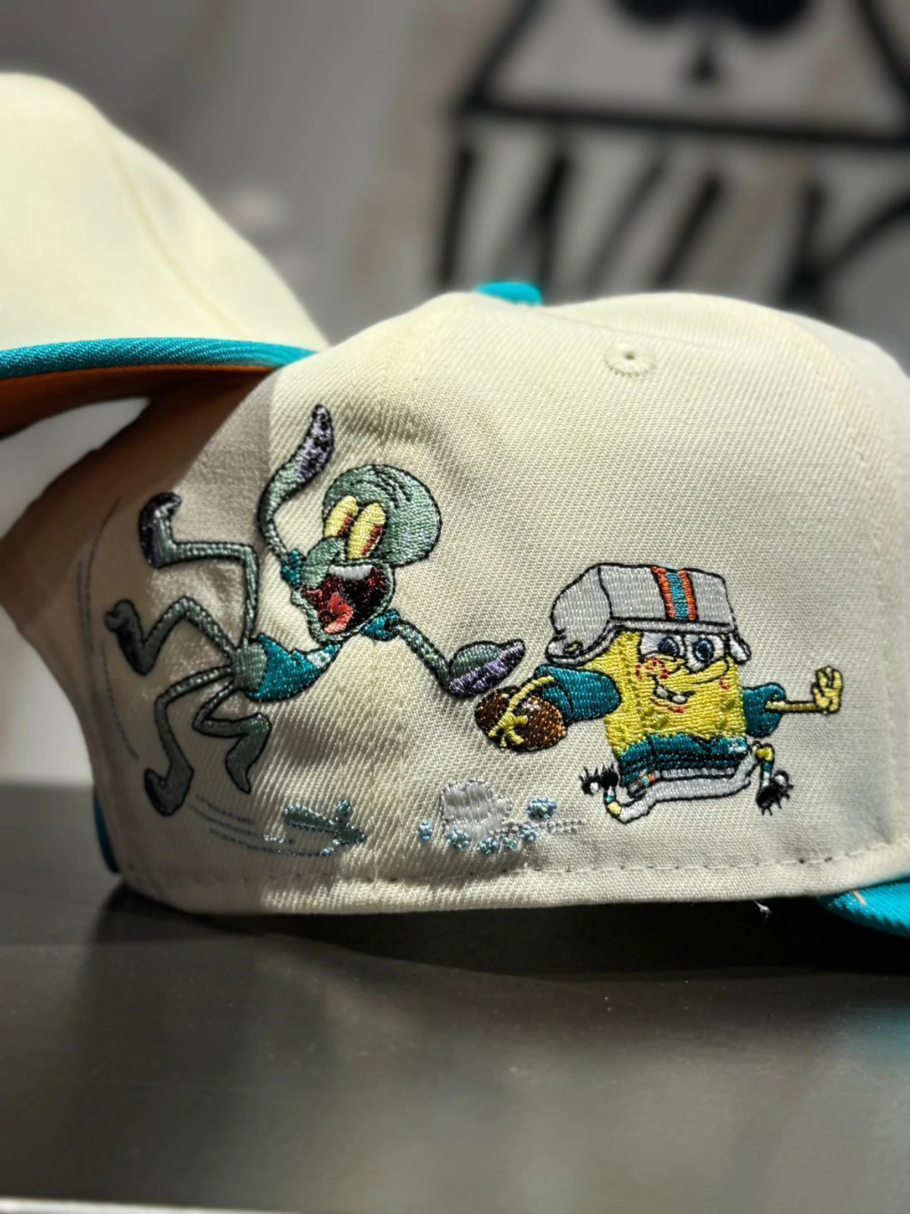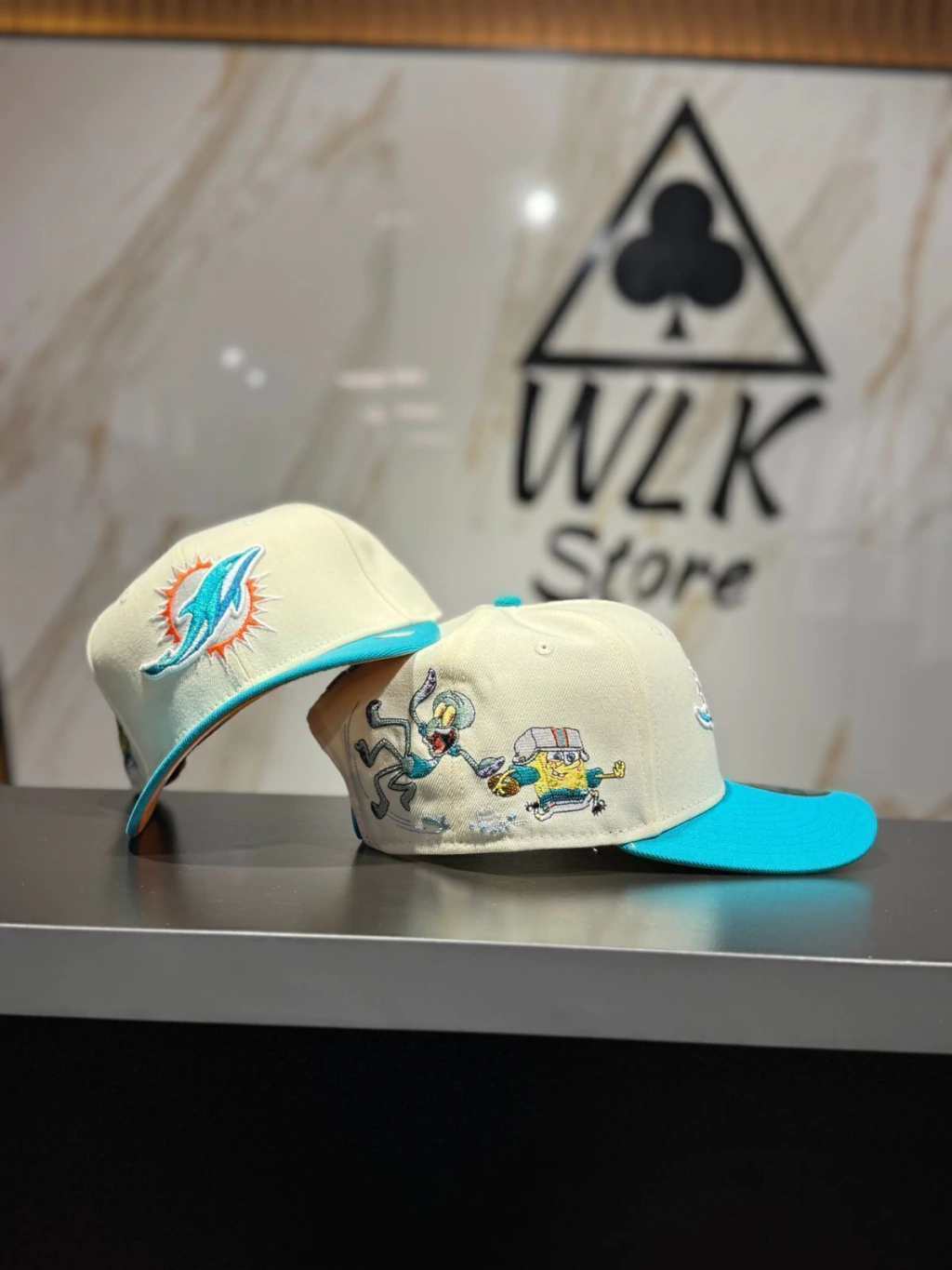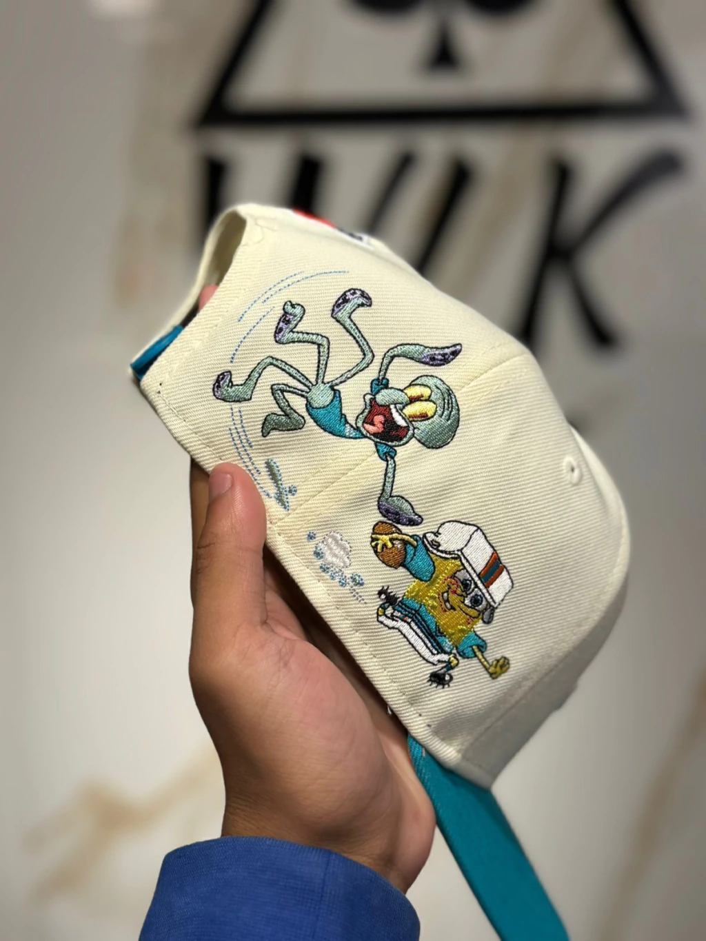 O boné New Era é a combinação perfeita entre estilo esportivo e diversão. Com base bege e aba azul turquesa, o modelo apresenta na parte frontal o bordado do Miami Dolphins, trazendo o visual autêntico das ligas americanas. Nas laterais, os personagens Bob Esponja e Lula Molusco aparecem em um bordado vibrante e detalhado, adicionando um toque descontraído e criativo. Produzido com materiais de alta qualidade, o boné oferece conforto, durabilidade e ajuste preciso, ideal para compor looks casuais e cheios de personalidade.