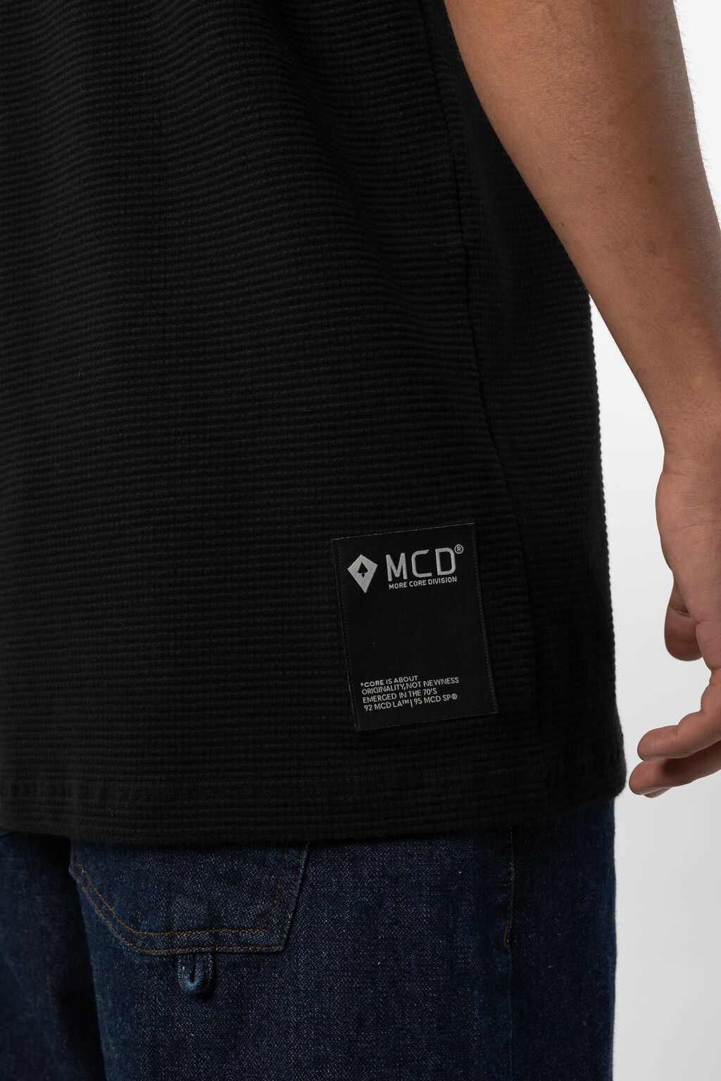 · Etiqueta bordada horizontal localizada na barra costas.