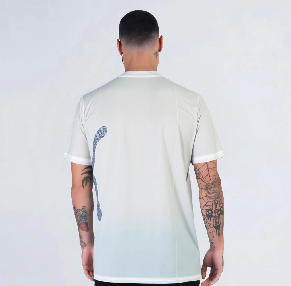 Detalhe Exclusivo: O logo não é uma estampa sólida, mas sim um preenchimento em um padrão pontilhado, pixelado ou texturizado (possivelmente um mesh ou estampa de pontilhismo) em tom azul marinho ou cinza escuro, adicionando um toque moderno e sutil de cor à peça clara.