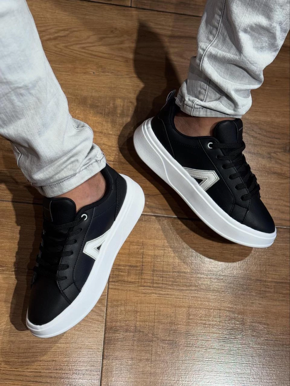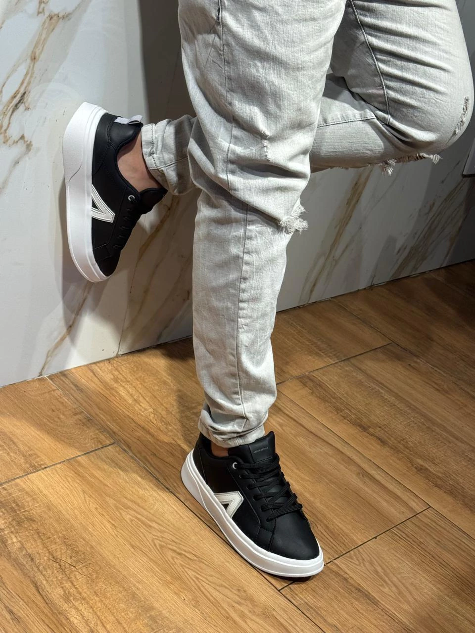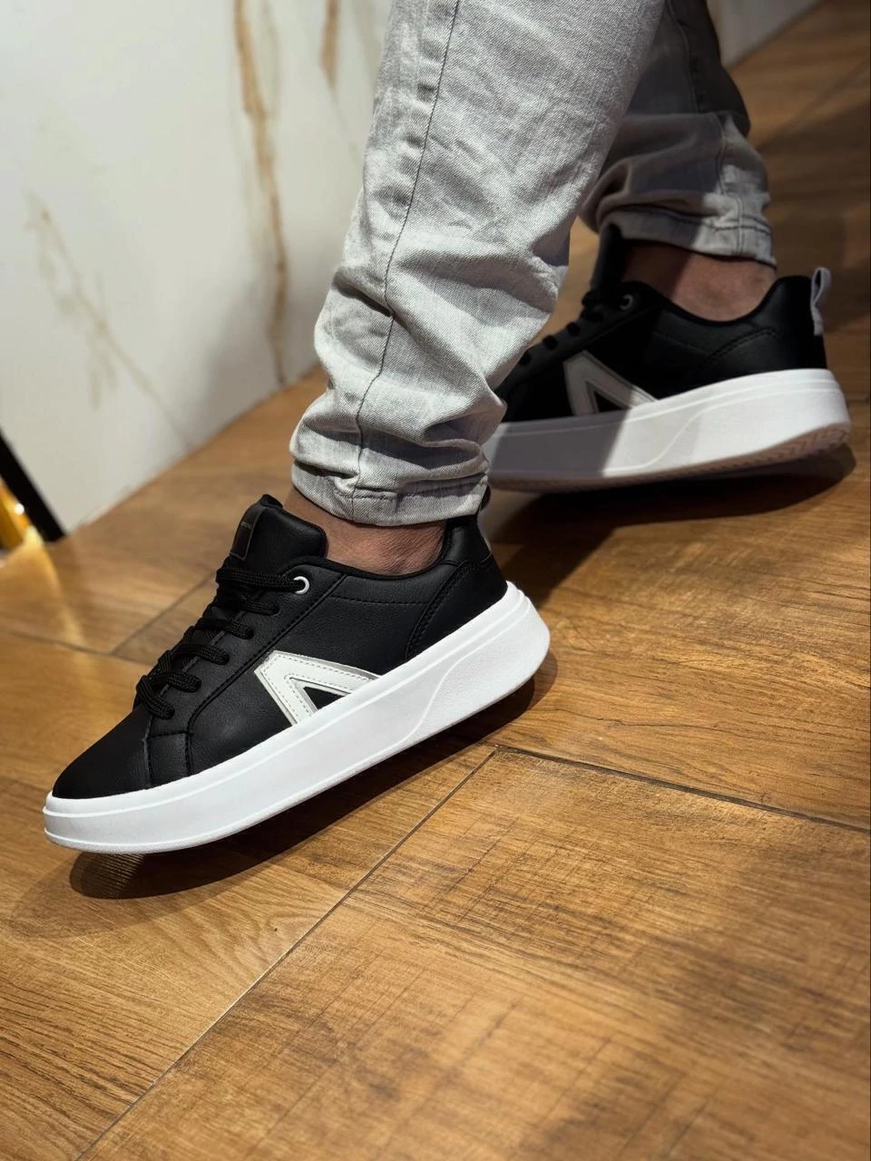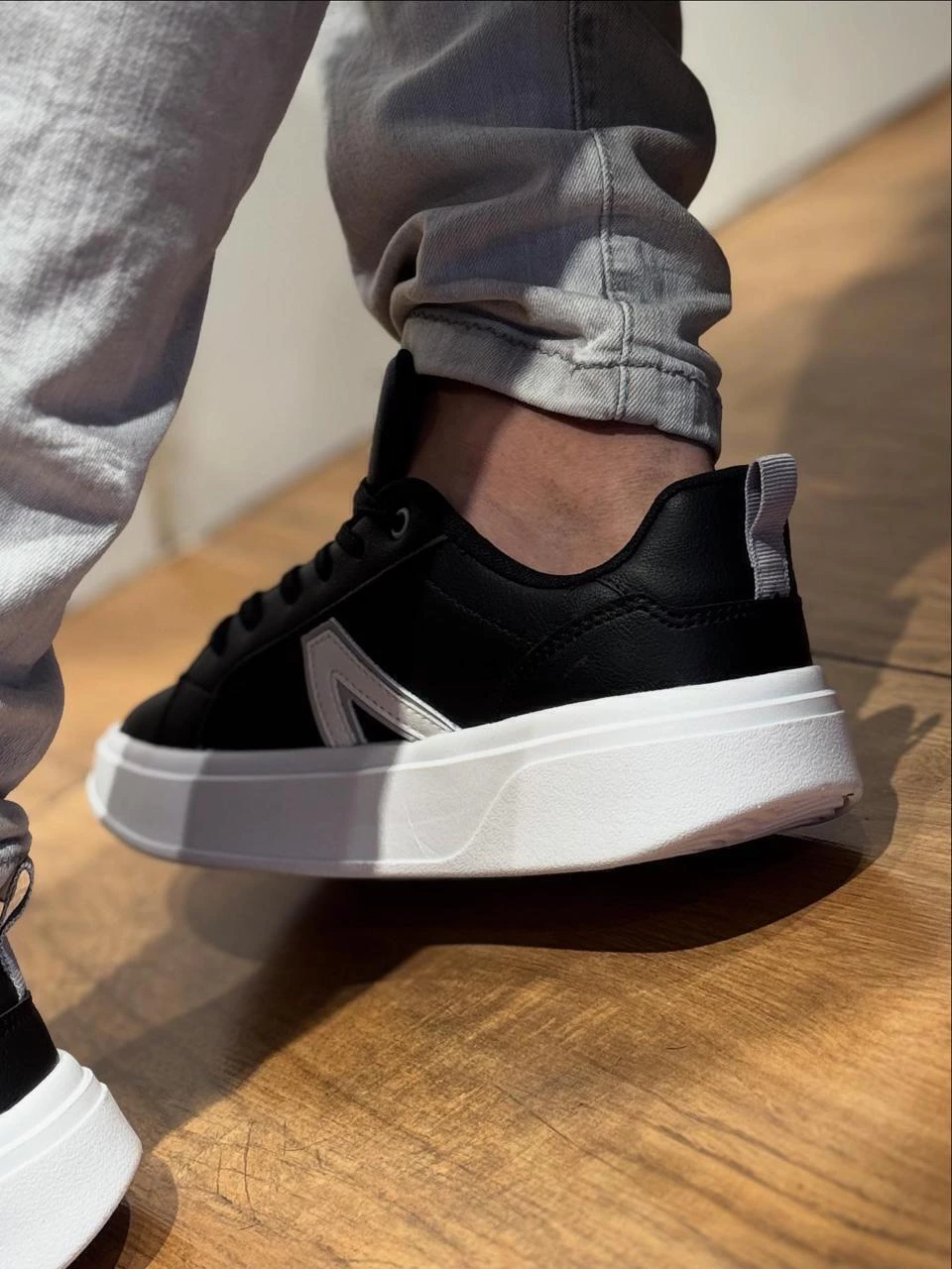 Com solado alto que garante presença e conforto, esse modelo combina as cores preto, branco e cinza em um design versátil e elegante.