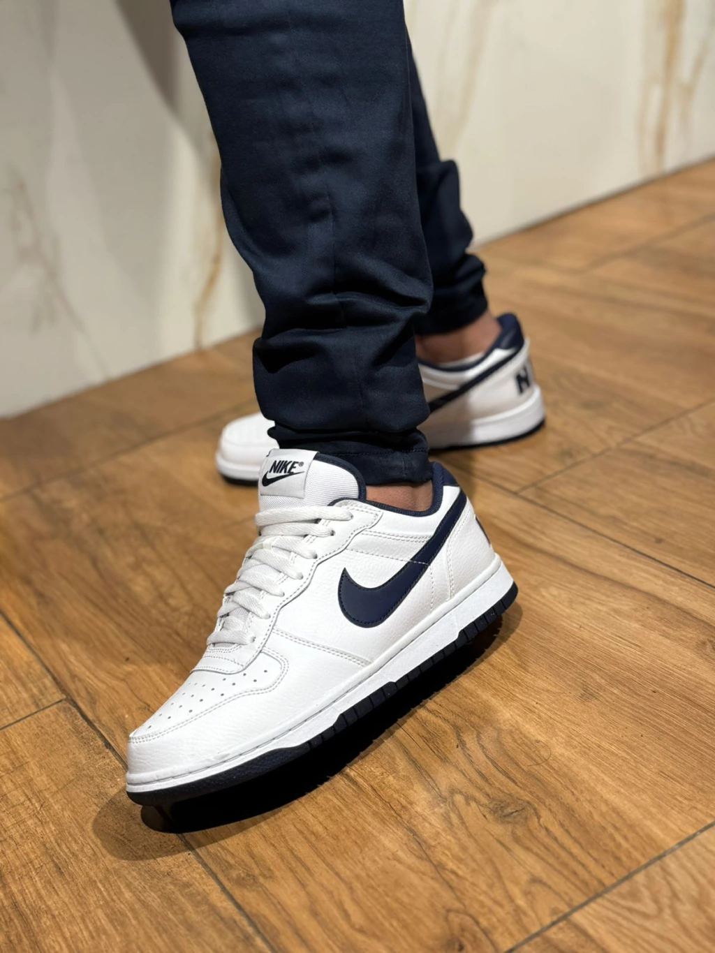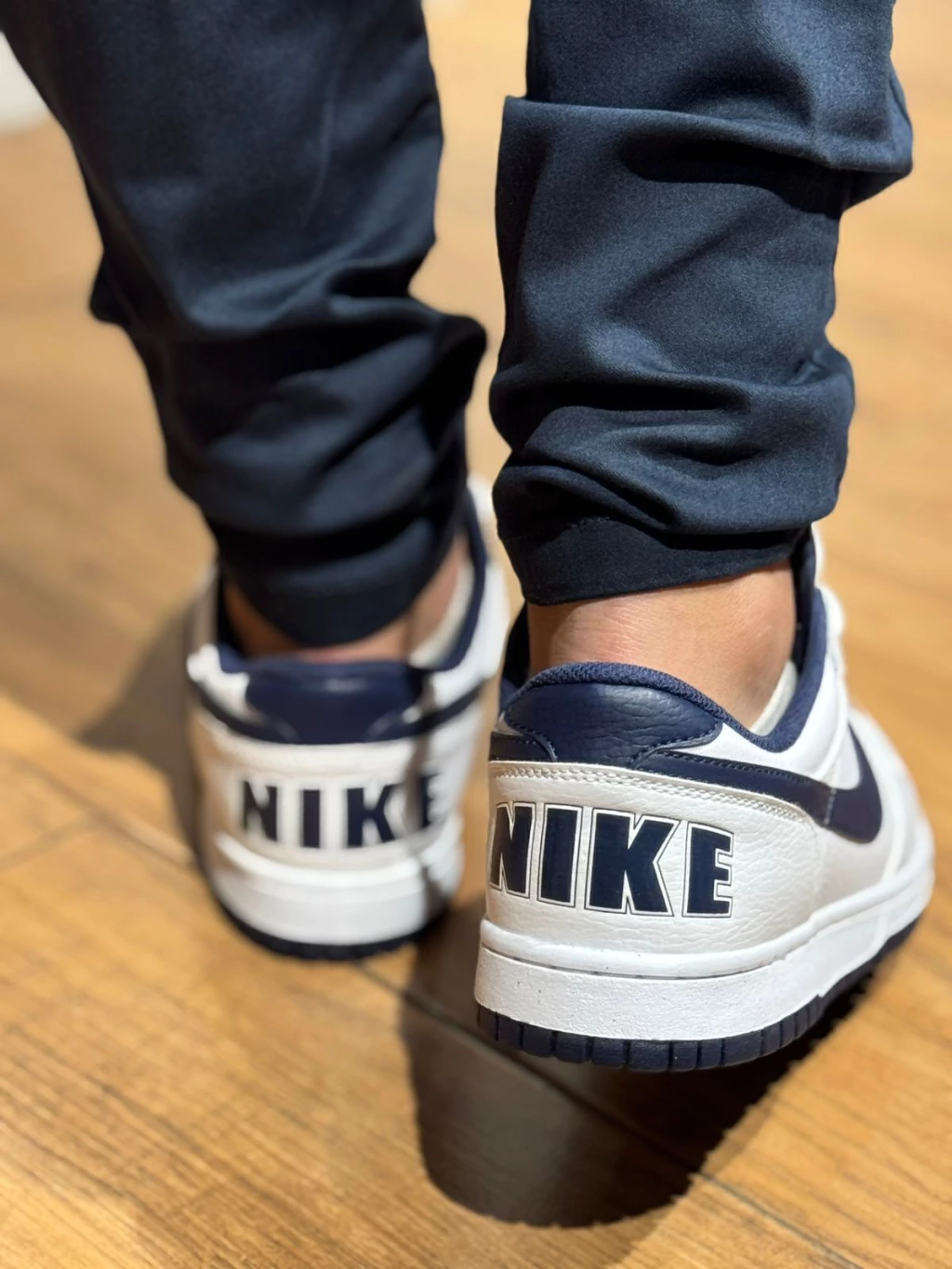Um tênis Nike de cano baixo que exala um estilo clássico e esportivo. O design apresenta um cabedal predominante branco, feito em material que imita couro (sintético ou legítimo), conferindo uma textura levemente granulada. O contraste é dado pelos detalhes em um profundo azul-marinho: o Swoosh lateral, o forro interno, a sola e a base da entressola. A lingueta branca exibe o logotipo 'NIKE' em preto. A construção robusta e a biqueira perfurada remetem a modelos icônicos de basquete. Está sendo usado com uma calça de corte ajustado de cor escura (azul-marinho ou preta), criando um visual limpo e atemporal, ideal para um look casual e elegante.
