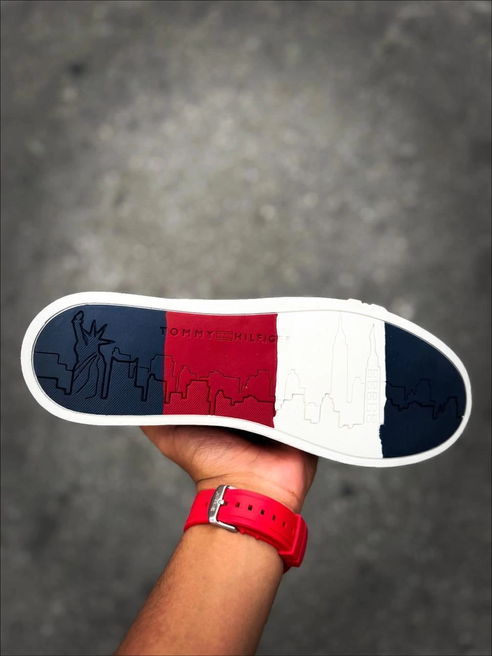 Detalhe Icônico Flag: O ponto focal é o icônico Flag Logo da Tommy Hilfiger na lateral, composto pelas listras em Preto, Branco e Vermelho, com o nome "HILFIGER" em destaque. Este detalhe injeta a identidade esportiva e preppy da marca.